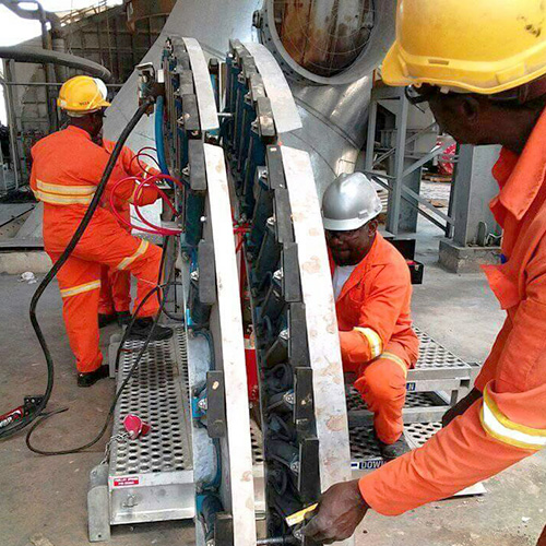 Refractory installers assembling brick rig machine to be used for clossing ring in the rotary cement kiln